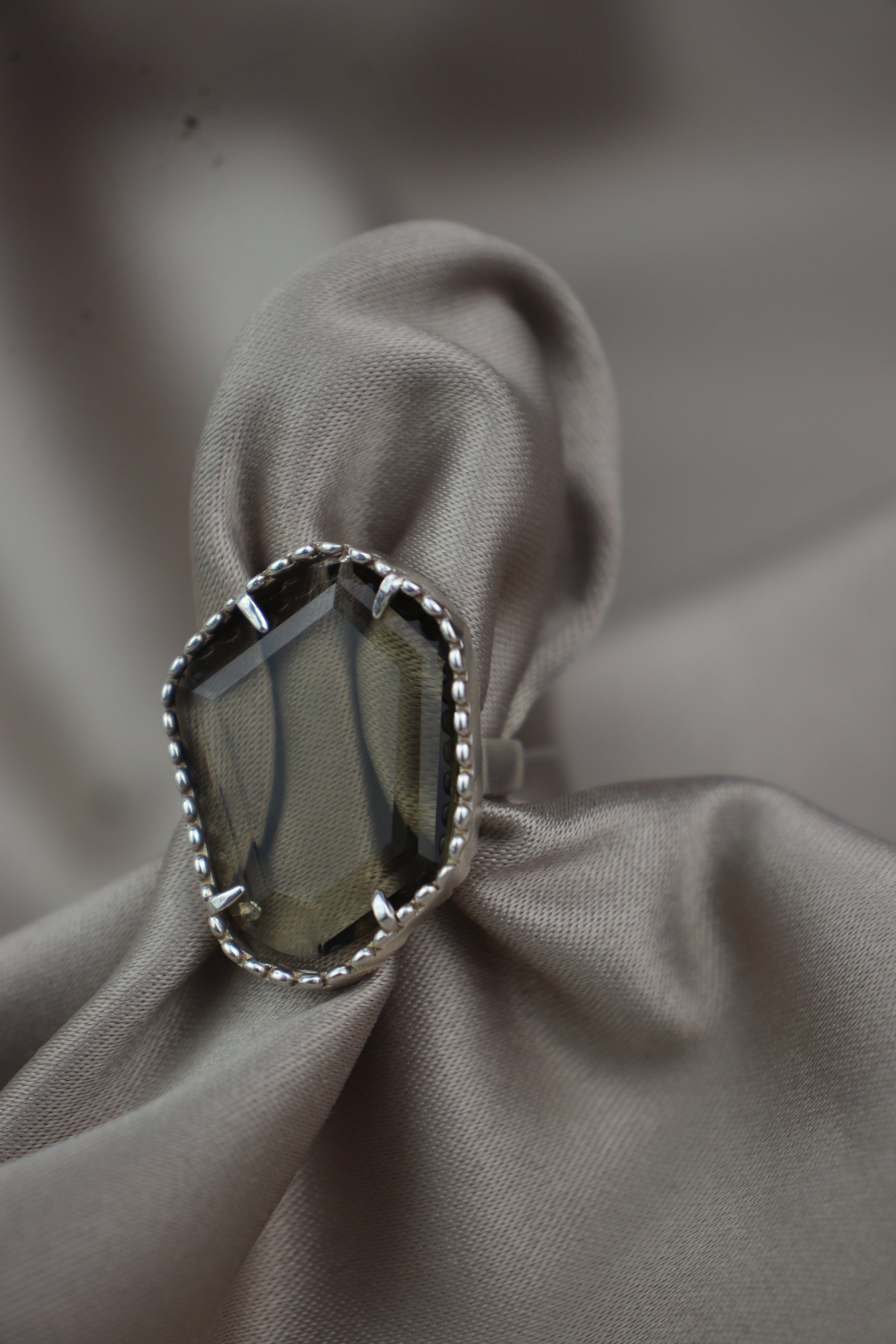 Anillo diferente en plata con piedra transparente facetada, perfecto para las personas que quieren lucir accesorios distintos y atemporales