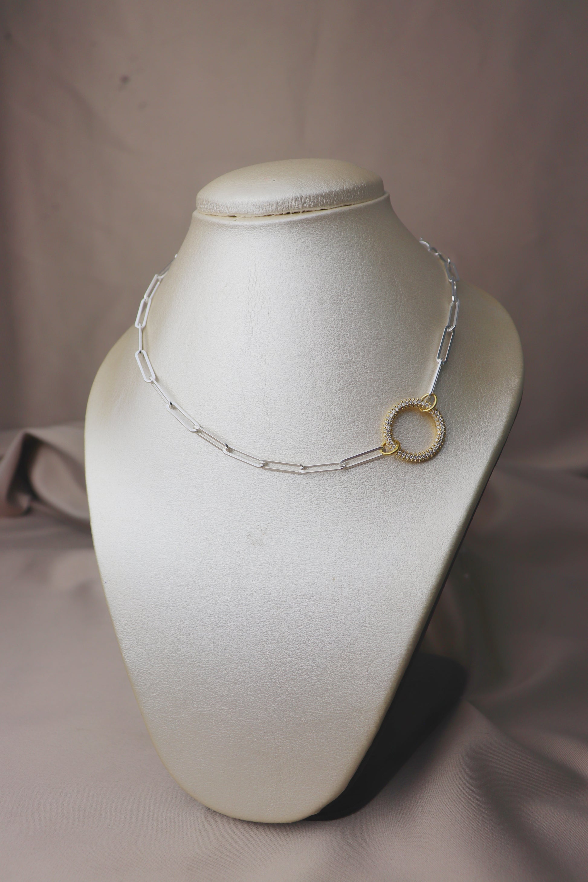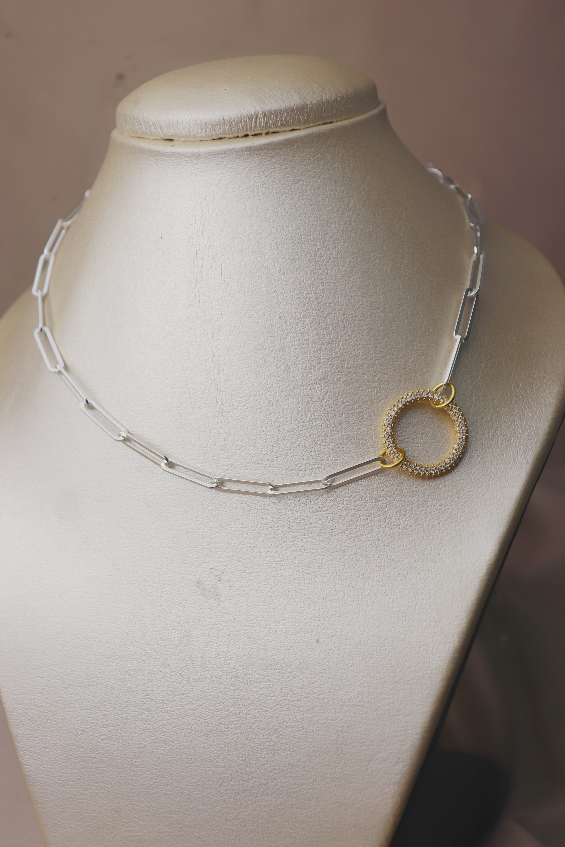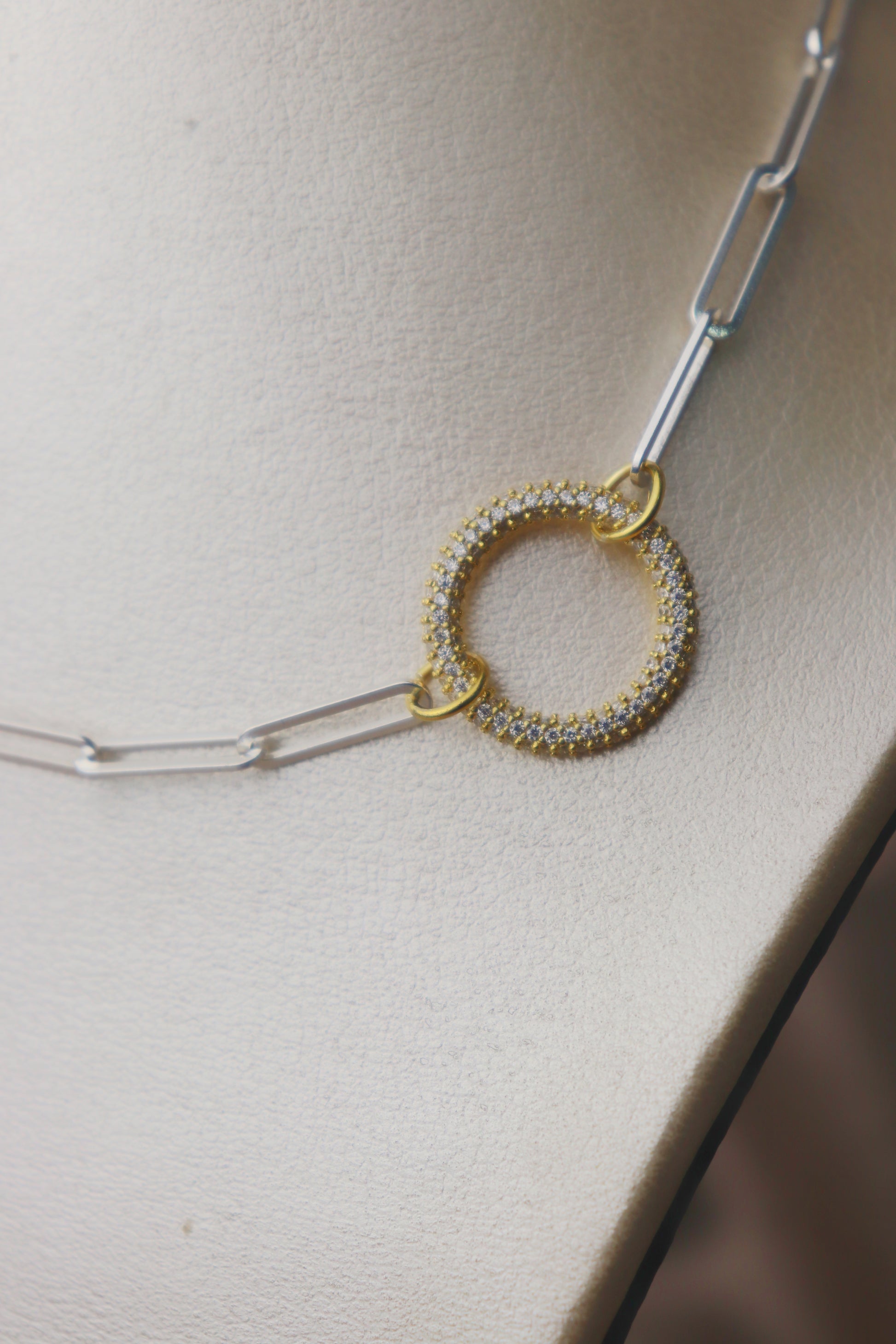 Cadena de tejido paper clic con dije en forma de circulo bañado en oro con circones color blanco