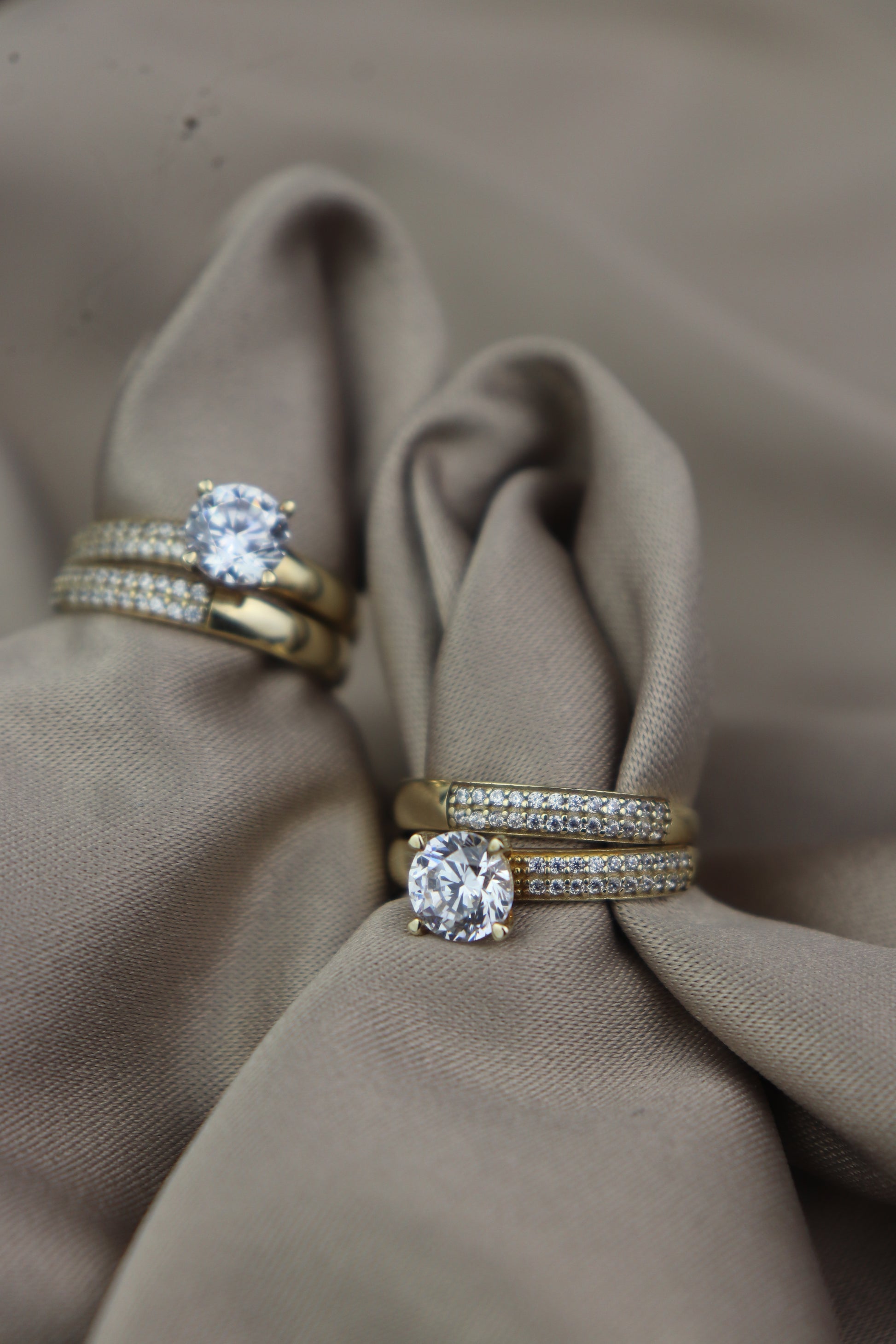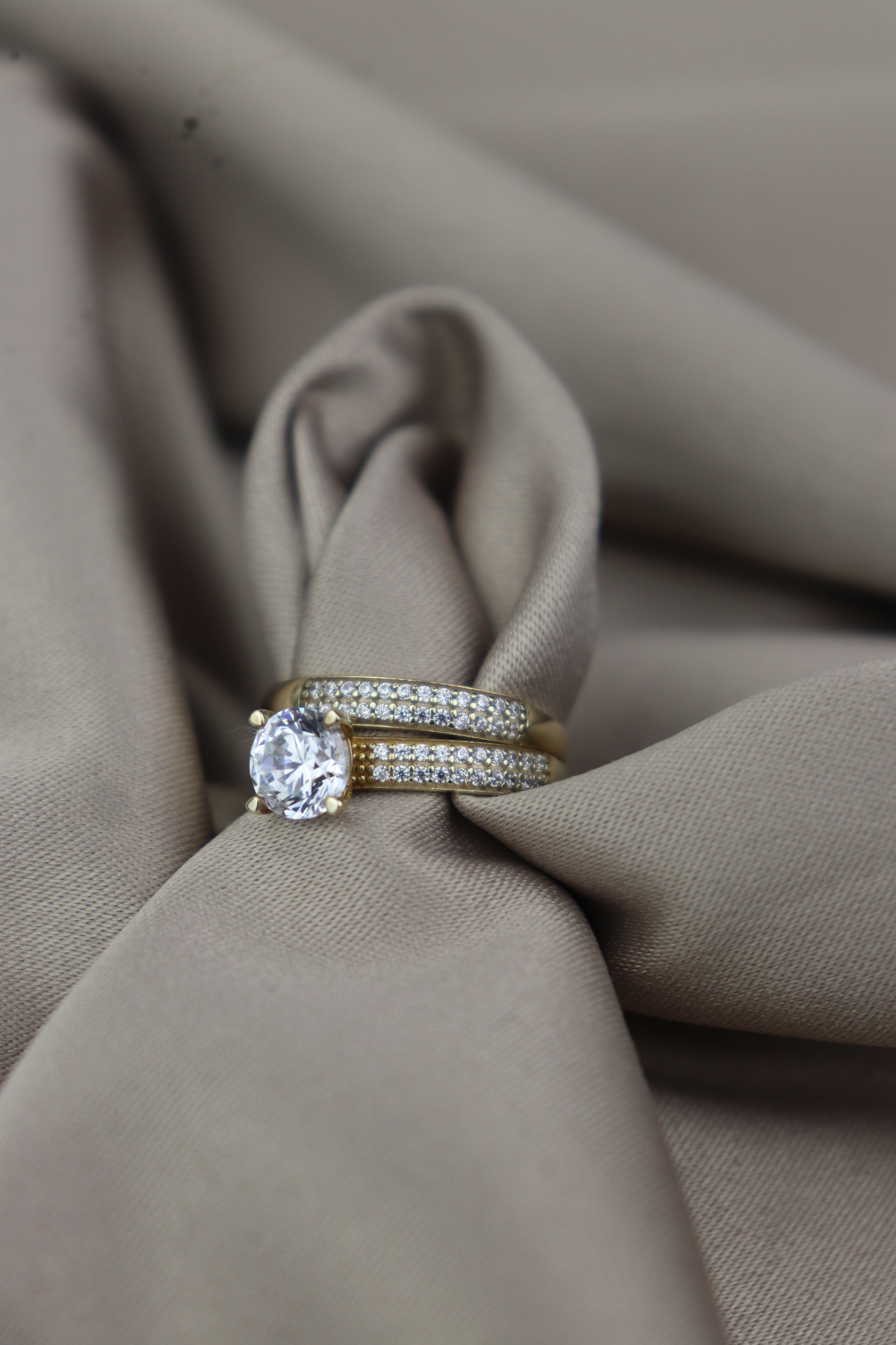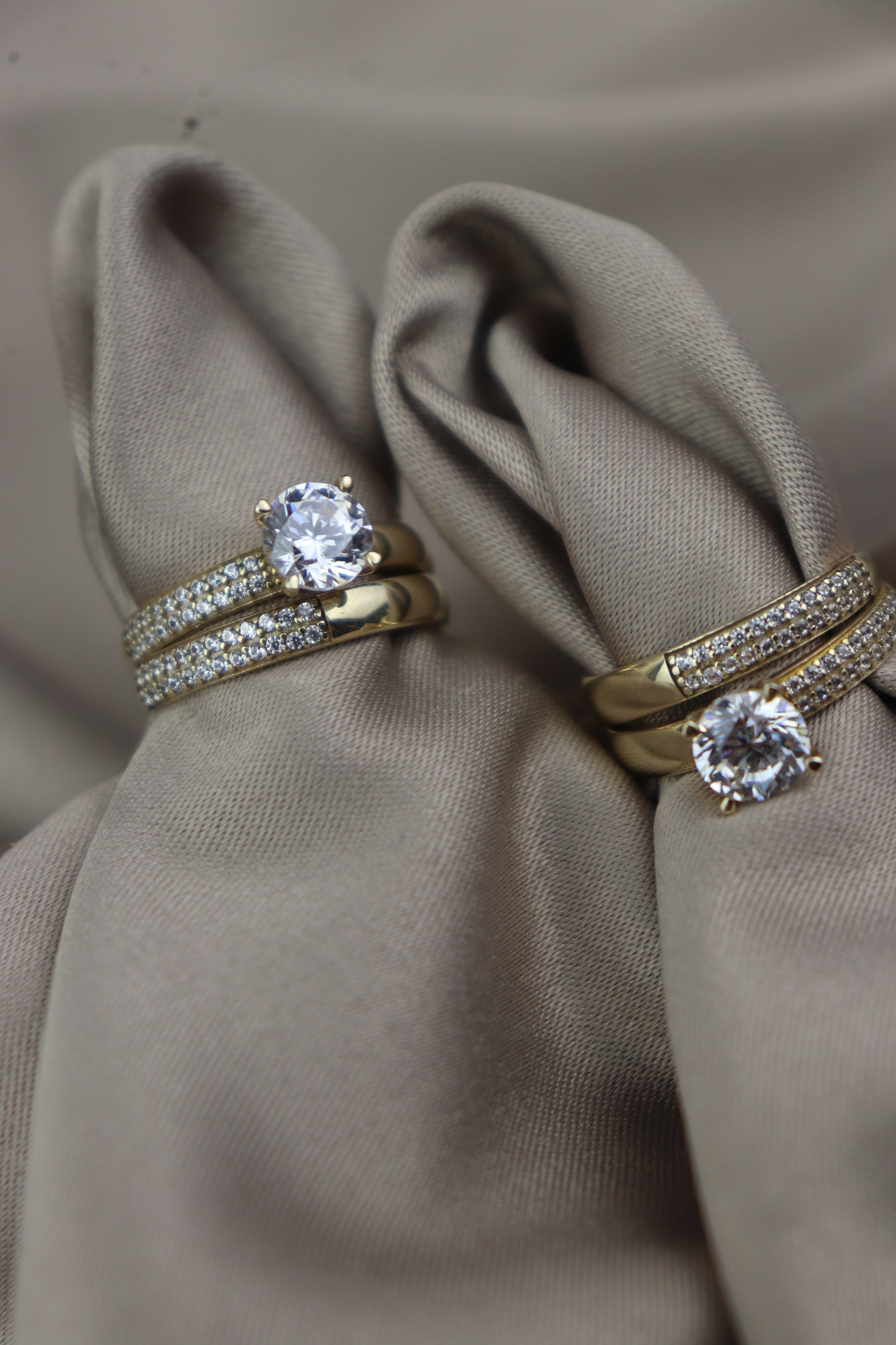 Duo de dama en oro de 10k con circón redondo central y lineas de circones blancos a la mitad