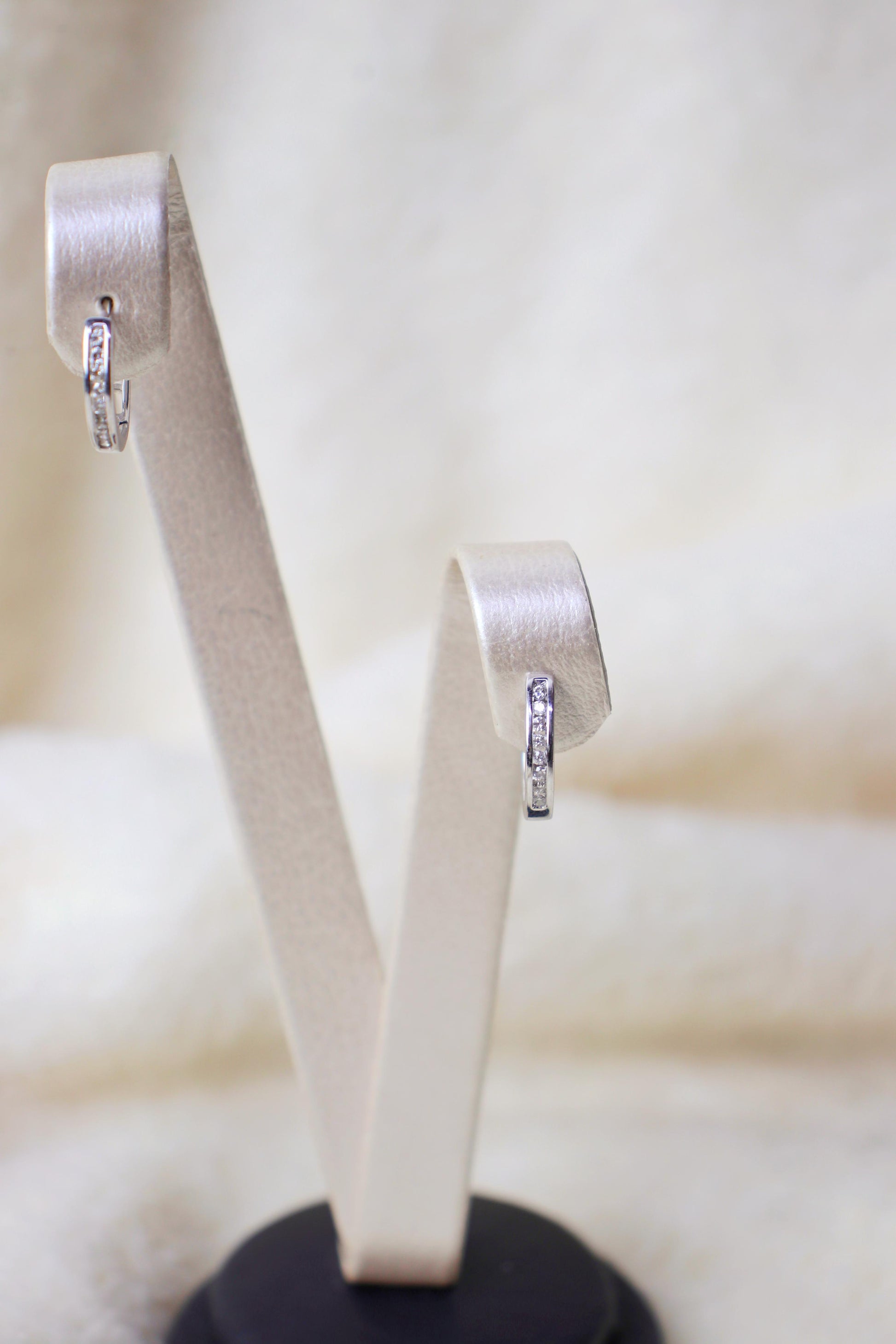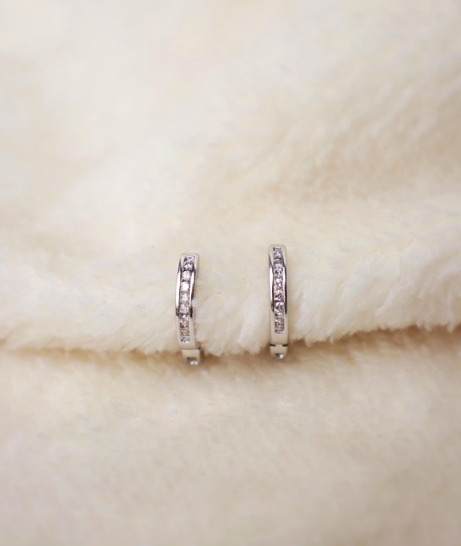 Clásicos y atemporales, estos huggies elaborados en oro blanco de 14 quilates están engastados con diamantes que aportan brillo sutil y sofisticación. Perfectos para el uso diario o para complementar cualquier look con un toque de elegancia.