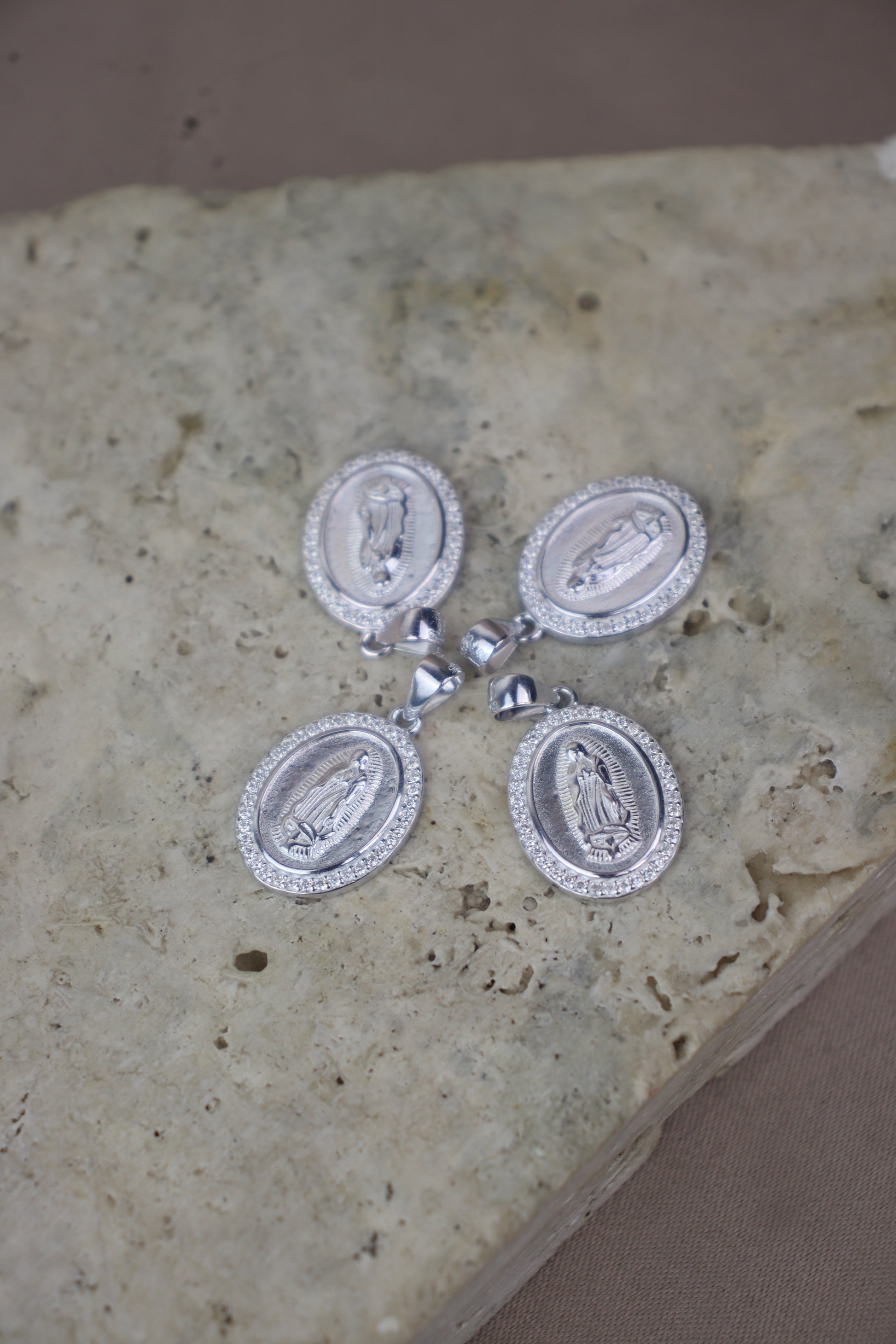 Medalla de la virgen de Guadalupe en plata italiana 925 con diseño de bordes con circones. Medidas 2.5 de largo y 1.5 de ancho