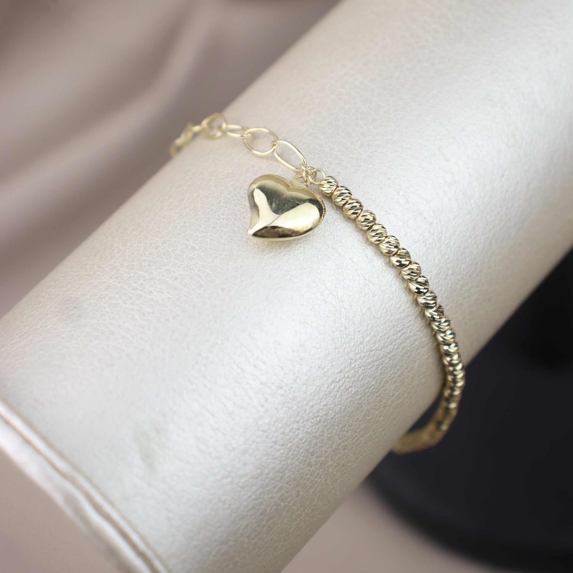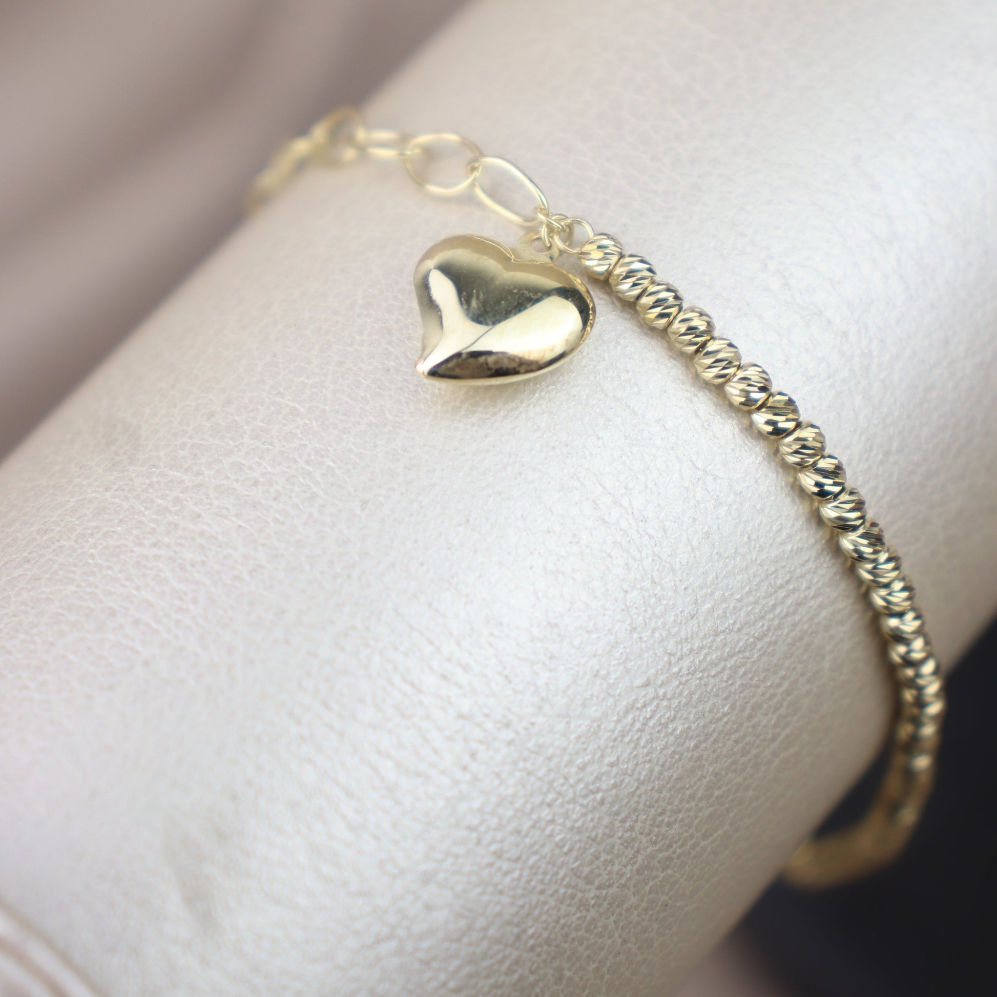 Pulsera diferente en oro amarillo de 10k, tiene una tejido de rolo abierto a un lado y el otro lado es un tejido militar o de bolitas diamantadas con un dije colgante de corazón en el centro. Perfecta para cada ocasión.