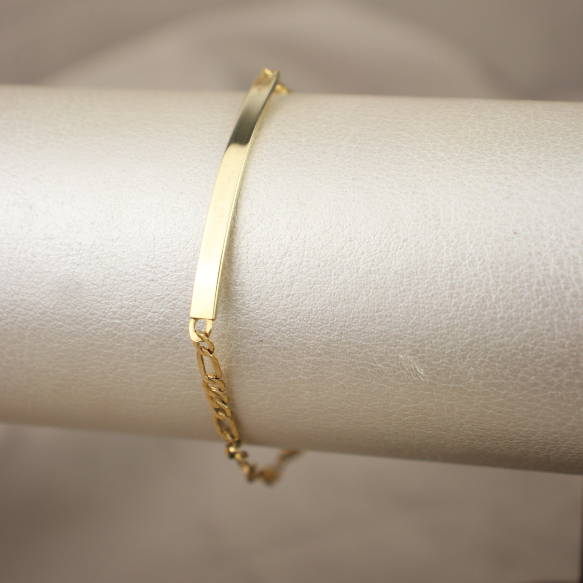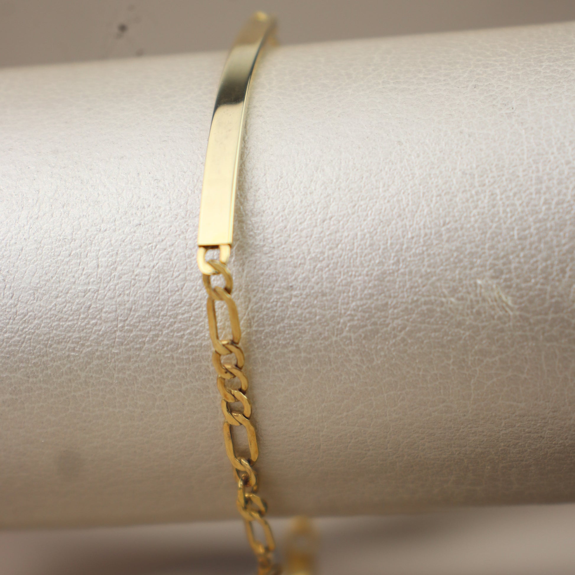 Pulsera de oro 10k tejido fígaro con placa lisa, perfecta para marca nombres, fechas o frases especiales.