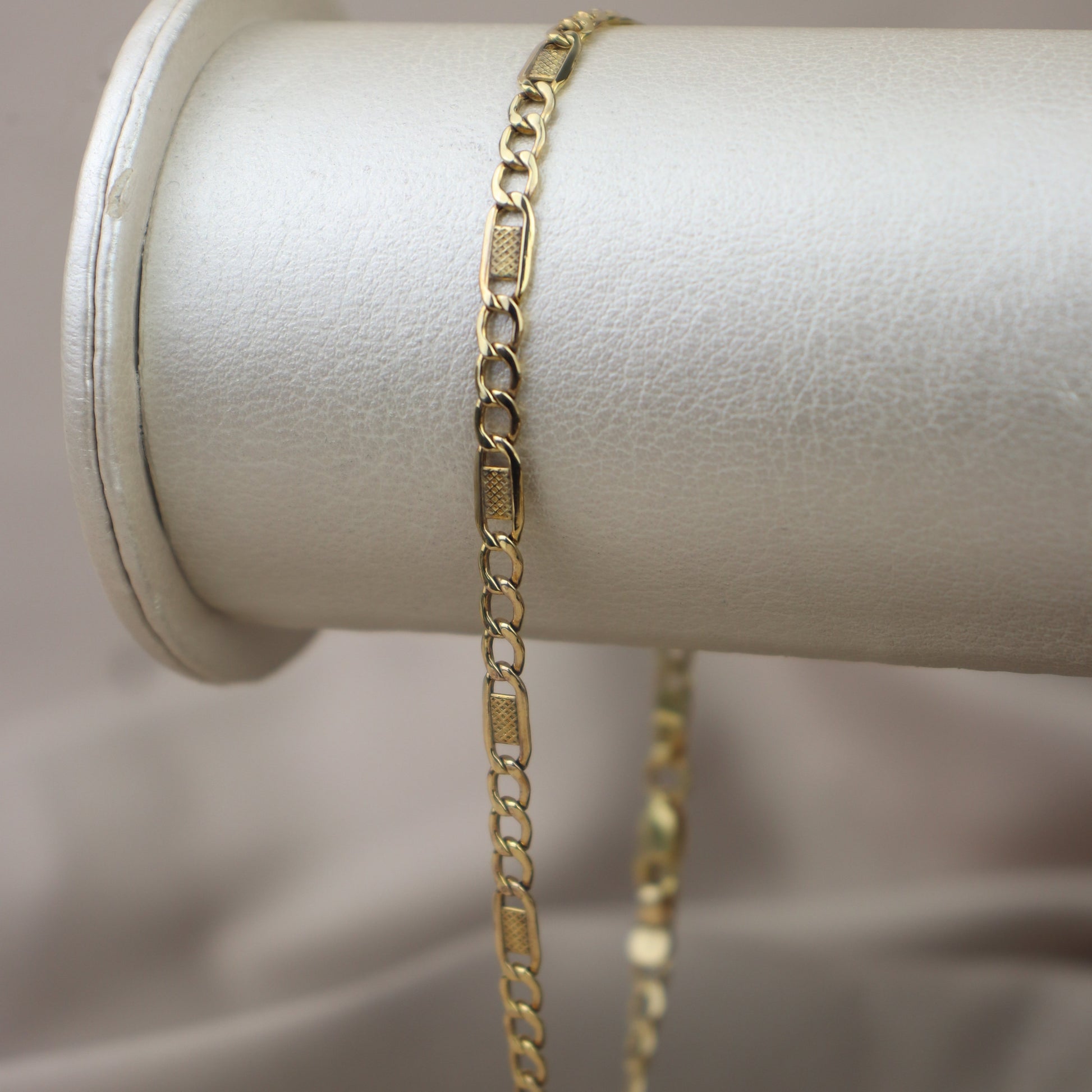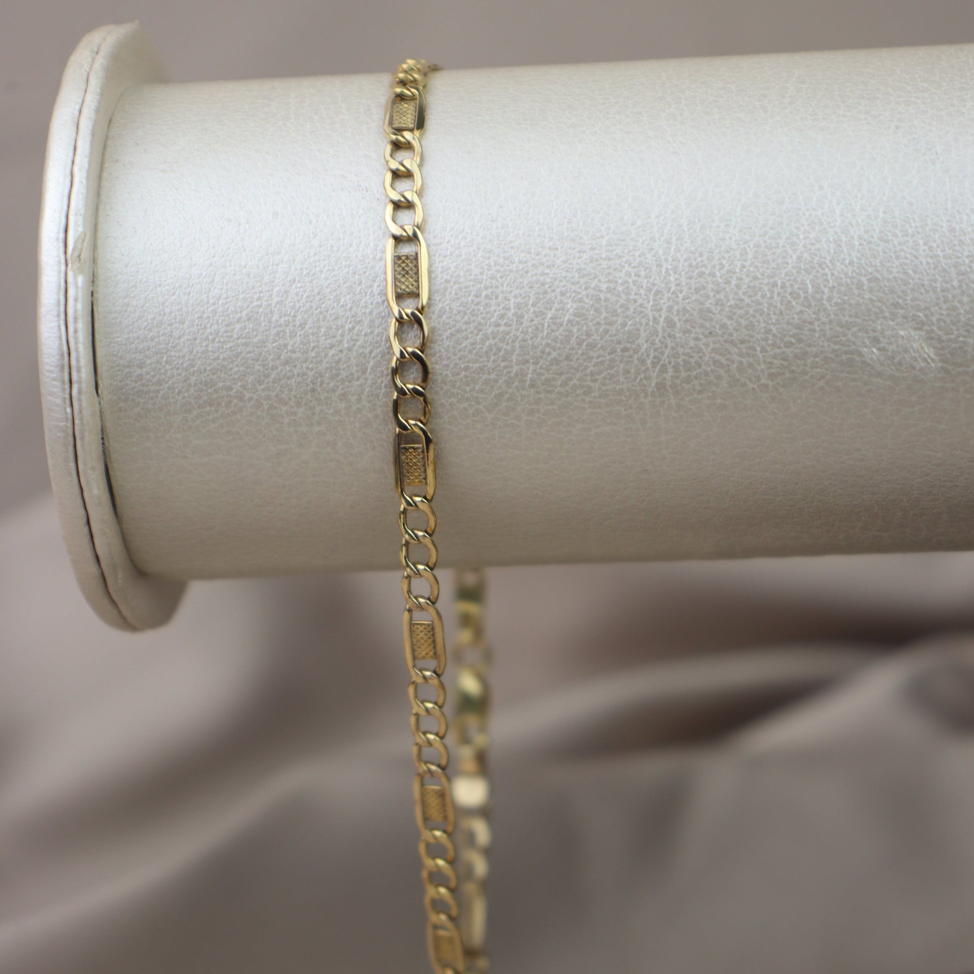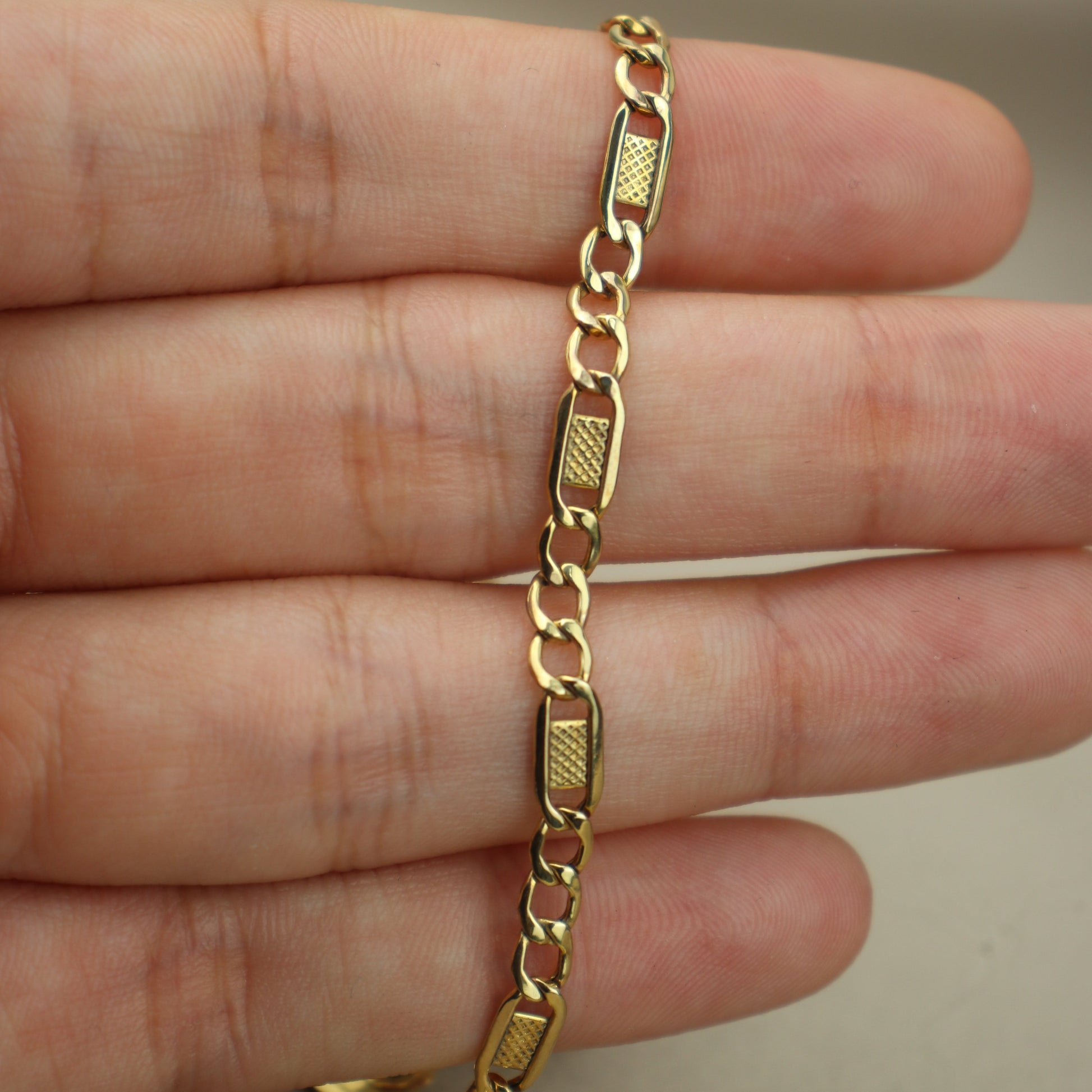 Tobillera de oro amarillo diseño 3x1 con placa.